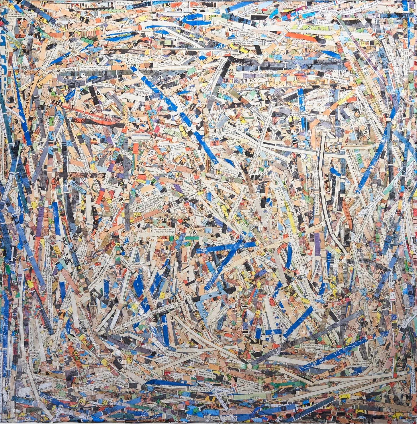 Pluridisciplinary artist of 45 years, Frédéric Menant works at the same time polaroids, thermal paper, as well as lenticular work, always making « paintings without paint ». Nowadays, he blows comic books that he worships to pieces, to make collages on canvas a real tribute. He always works with carefully selected original comic editions from the 70’s for the quality of the colors but also the quality of the paper. As his inspirations, we can mention Villeglé and Hains, but also Pollock, Braque, or Hergé. His collages let us enter the canvas, dive into the banners, the material, in the stories, but also in memories, where nothing is left a coincidence. Frédéric Menant is presenting thick pieces, embossed, where only glue holds down the stories, canvas telling us about time, memories, and dreams.