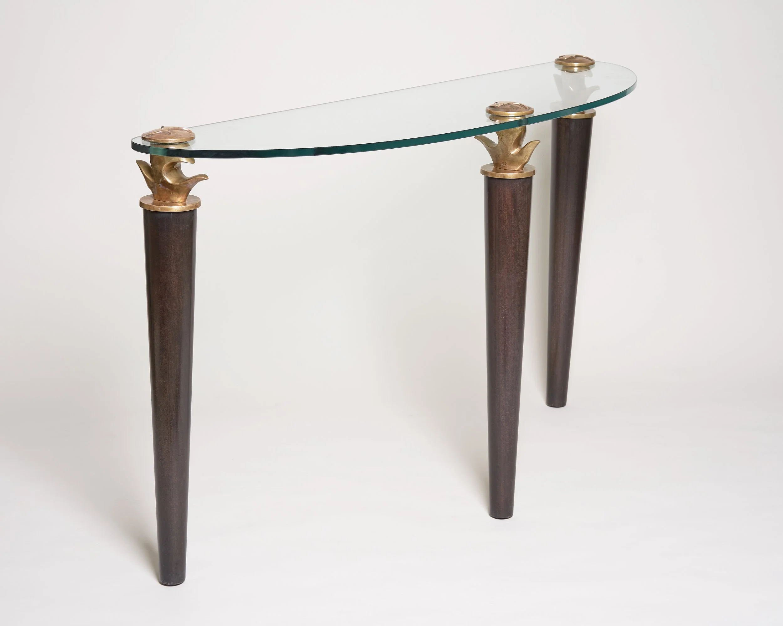 Console tripode « Concerto », créée en 1995, en bois et bronze doré, le plateau en verre épais.