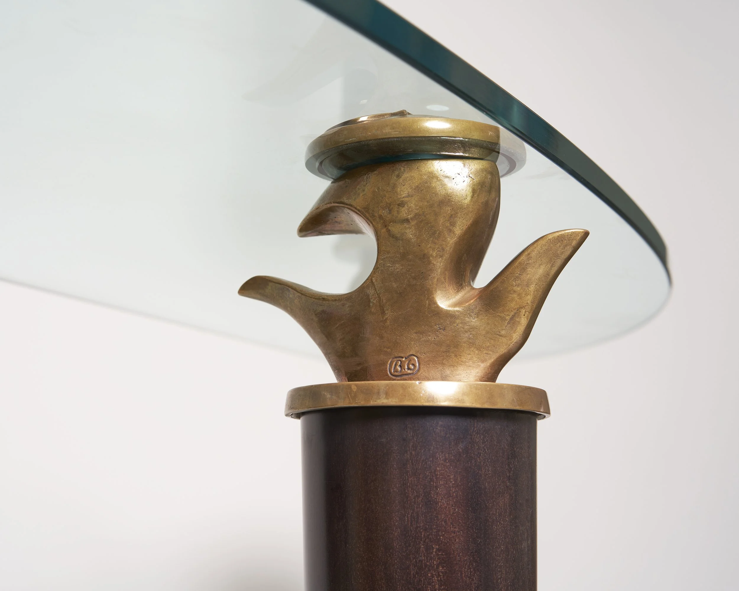 ELIZABETH GAROUSTE & MATTIA BONETTI — Console Concerto                                                                                                                                                       “Concerto” tripod console, created in 1995, in wood and gilded bronze, the top in thick glass.                                                            Signed "B.G" on the leg